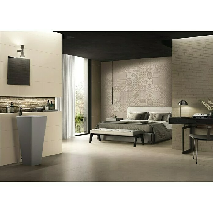 Die unglasierte Feinsteinzeugfliese taupe von Ambiente by Palazzo zeichnet sich durch ein hochmodernes Design aus und vermittelt gleichzeitig eine elegante Atmosphäre. Diese hochqualitative Fliese wird vor dem Brennvorgang mit einer Vergütung veredelt, die aufgrund ihrer Zusammensetzung (erhöhter Anteil an mineralischem Feldspat) zu einer vollen und dichten Sinterung führt. Hierdurch ist die Oberfläche sehr gut zu reinigen und eine zusätzliche Versiegelung nach der Verlegung wird nicht benötigt. Die neueste Digital-Technologie ermöglicht ein breites Spektrum an Texturen die sich kaum wiederholen. Zusätzlich ermöglichen die rektifizierten Kanten eine besonders maßgenaue Verlegung mit schmalen Fugen. Die Fliese ist für private und gewerbliche Einsatzbereiche geeignet. Wir empfehlen eine Verlegung versetzt im 1/3-Verband. Ebenfalls im Format 30×60 cm erhältlich.