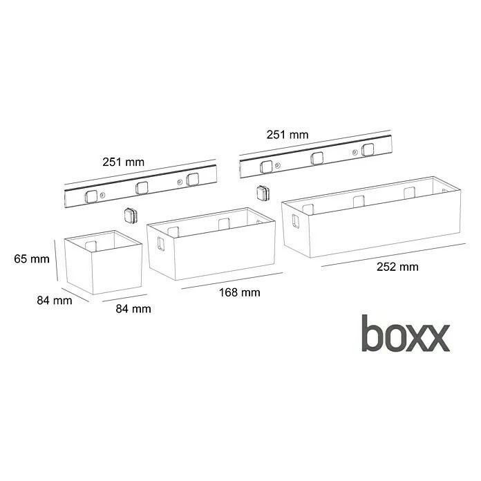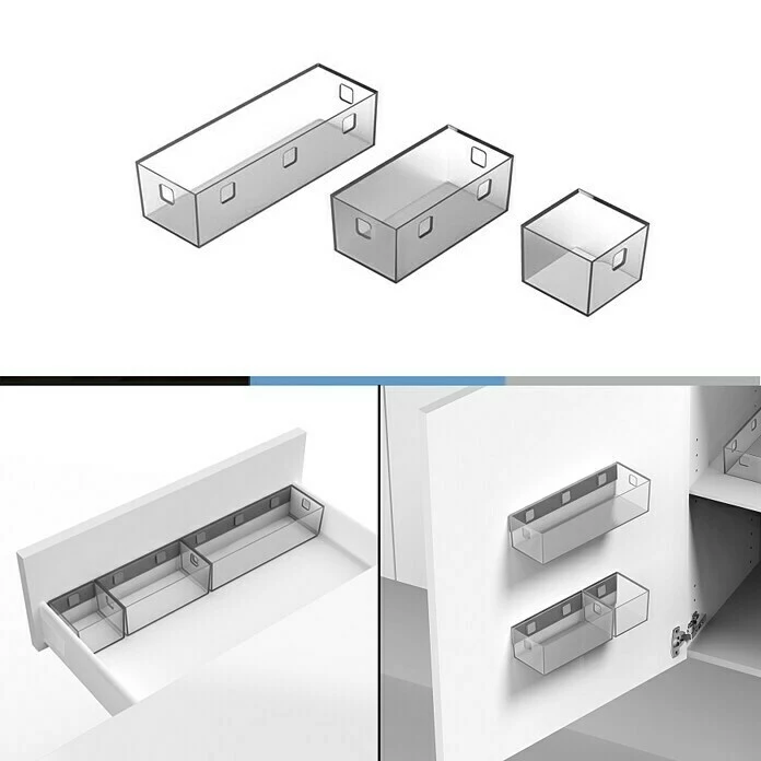 Das essensa Aufbewahrungsbox-Set Boxx ist ein System aus drei unterschiedlich großen Behältnissen mit vielfältigen Einsatzmöglichkeiten produziert in Deutschland. Das Set besteht aus drei Aufbewahrungsboxen in den Größen klein, mittel und groß. Die Boxen können mit den beiliegenden Befestigungsleisten und den Verbindungsclips frei kombiniert werden. So können die Behälter an Tür-Innenseiten der Küche oder Hauswirtschaftsschränke befestigt werden. Auch in Schubladen lässt sich mit den Boxen einfach Ordnung halten. Oder die Behälter werden einfach mit der Befestigungsleiste an der Wand befestigt oder freistehend in Küchenschränken oder auf die Arbeitsplatte gestellt. Die Befestigungsleiste wird hierbei mit Schrauben befestigt und die Boxen aufgesteckt, die Verbindung der Module untereinander erfolgt mit Verbindungsclips. Die kompakte Bauweise ermöglicht eine einfache Reinigung unter laufendem Wasser mit etwas Spülmittel. Die Abmessungen der kleinen Box betragen 8,4 x 8,4 x 6,4 cm (BxHxT), die Abmessungen der mittleren Box betragen 16,8 x 8,4 cm x 6,4 cm (BxHxT) und die Abmessungen der großen Box betragen 25,2 x 8,4 x 6,4 cm (BxHxT).