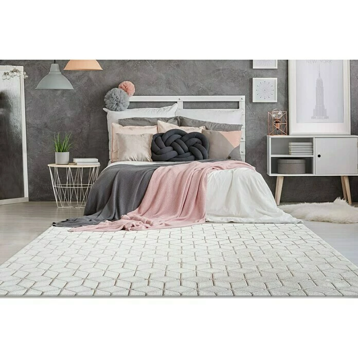 Der Kayoom Hochflorteppich Vivica ist ein kuschelweicher Teppich mit spannender 3D-Grafik. Der besondere Look dieses Hochflorteppichs zeichnet sich durch das attraktive geprägte Muster aus, das für einen attraktiven 3D-Effekt sorgt. Durch die geometrischen Formen des Musters erhält der Teppich zudem einen stilvollen Retro-Charakter. Der ansonsten schlichte und einfarbige Flor kann sich in jedem Wohnraum sehen lassen und lässt sich dank der schlichten Eleganz mit jeder Einrichtung kombinieren. Die kuschelige Oberfläche aus 100 % Mikro-Polyester sorgt für eine gemütliche Atmosphäre im Raum. In Räumen mit Fußbodenheizung kann der Teppich ebenso problemlos ausgelegt werden. Durch einen Rücken aus Baumwolle und die Ziernaht rundherum wird der Teppichflor verstärkt. Gleichzeitig wird ein Ausfransen des Teppichs durch die Kettelung verhindert.