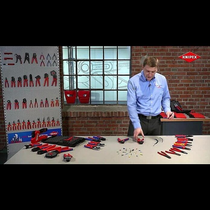 Die selbsteinstellende Crimpzange für Aderendhülsen der Marke Knipex mit Seiteneinführung ist für Vierkant-Pressungen von Aderendhülsen von 0,08 – 16 mm² geeignet. Dabei können isolierte, unisolierte und Twin-Aderendhülsen bis 2 x 4 mm² oder 2 x AWG 12 verwendet werden. Die selbsttätige Einstellung der Crimpzange auf die Größe der Aderendhülse ermöglicht präzises und gleichzeitig schnelles Arbeiten. Eine komfortable Griffweite garantiert auch bei großen Aderendhülsen handschonendes Verpressen. Eine entriegelbare Zwangssperre sorgt hierbei automatisch für den richtigen Druck auf die Aderendhülse.