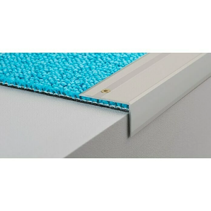 Das LOGOCLIC Treppenkantenprofil schützt zuverlässig die Kanten des Bodenbelags auf der Stufenkante. Versenkte Schraublöcher ermöglichen eine dauerhafte Befestigung des Winkelprofils. Die gerillte Oberfläche erhöht zusätzlich die Sicherheit auf der Trittfläche.