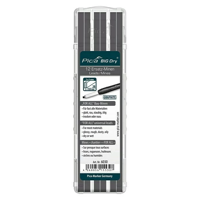 Die Ersatzminen Big Dry 6030 für den Zimmermannsbleistift Pica Big Dry enthält 12 Minen im praktischen Kunststoffetui. Die Minen eignen sich für fast alle Materialien, egal ob raue, nasse, glatte, ölige oder staubige Oberflächen. Von glatten Flächen lässt er sich mit einem feuchten Tuch abwischen. Die Rechteck-Minen haben einen Querschnitt von 2 x 5 mm und sind 150 mm lang.