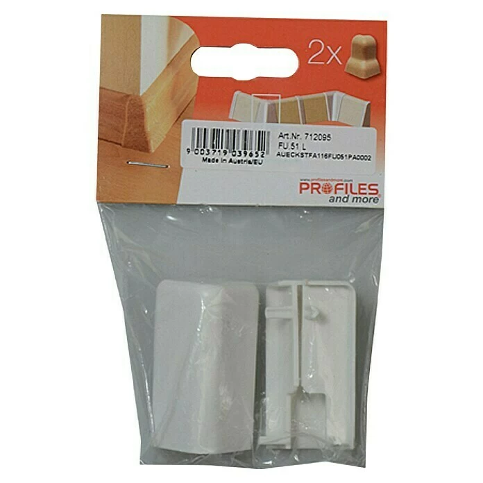 Die Außenecke von Profiles and more besteht aus hochwertigem Kunststoff und erleichtert die Sockelleistenmontage. Die Ecke wird einfach zwischen die Enden der rechtwinkelig geschnittenen Leisten gesteckt. Dadurch ist kein komplizierter Gehrungsschnitt mehr notwendig und die Leistenecke ist gegen Stöße geschützt.