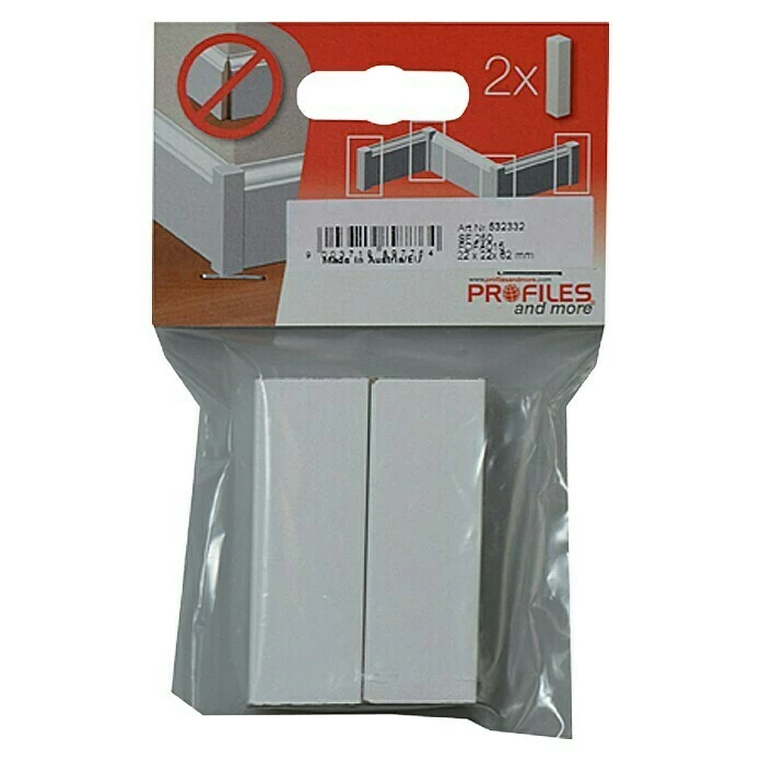 Die Eckstäbchen von Profiles and more sind universell als Innen-, Außen- oder Endstücke einsetzbar. Die optisch dezent auffallenden Stäbchen ersparen das mühsame Schneiden von Gehrungen und bieten gleichzeitig Schutz von exponierten Außenecken. Vor der Montage werden die Eckstäbchen in der Höhe an die Sockelleiste angepasst – Höhe der Sockelleiste +2 mm – und schließlich an die Stirnseiten der Leiste geklebt. Zum Befestigen dürfen keine silikonhaltigen Klebstoffe verwendet werden. Geeignet sind Montagekleber auf PUR-Basis oder Kontaktkleber. Bei Verlegung von Kabeln hinter der Sockelleiste wird das Stäbchen einfach an der Rückseite entsprechend ausgeschnitten.