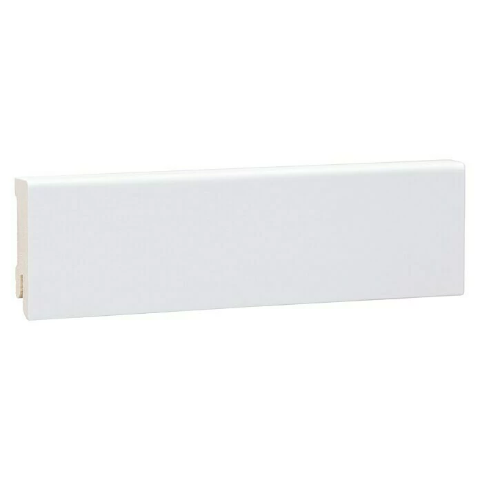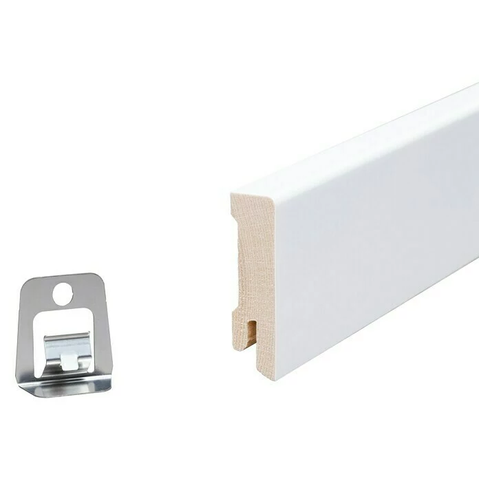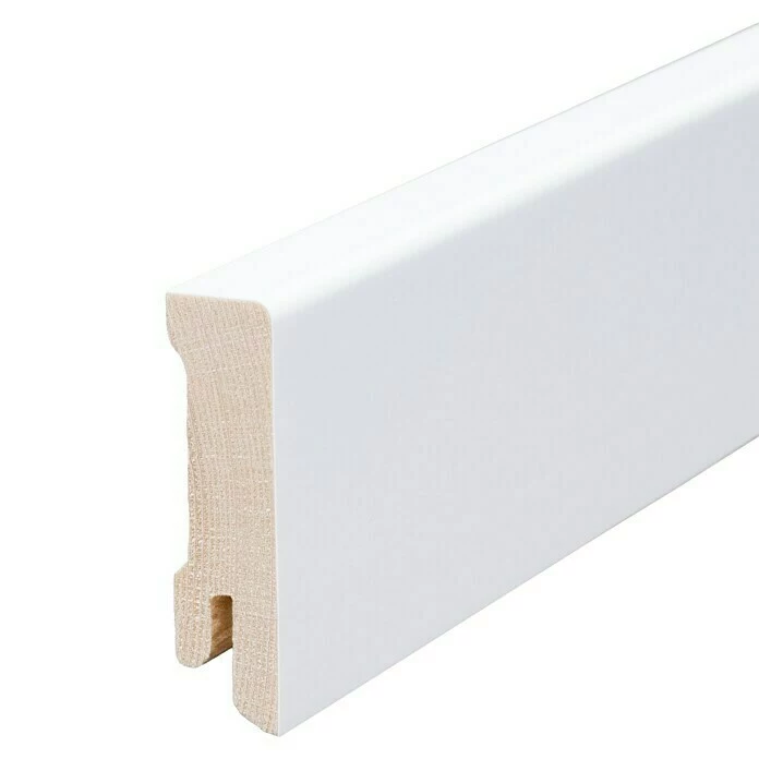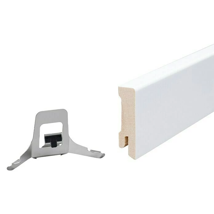 Die Sockelleiste aus einem hochwertigen Fichtenholzkern ist von einer Starkfolie in klarem, reinem Weiß ummantelt. Das Ergebnis ist eine besonders robuste, langlebige Leiste, die mit einem puristischen Look punktet. Dieser wird durch ihr modernes, minimal gerundetes Profil noch verstärkt, da dieses zu vielerlei Einrichtungsstilen passt. Einen praktischen Vorteil bietet die Clip-Nut der Sockelleiste. Damit ist eine einfache und verdeckte Montage möglich.