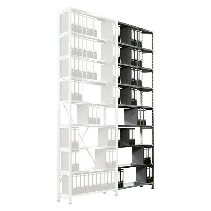 Das Metallregal von Scholz gibt Ihnen die Möglichkeit, auf geringer Grundfläche den größtmöglichen Stauraum in Anspruch zu nehmen. Das Regal bietet auf 9 Regalböden passgenauen Stauraum für Aktenordner oder andere einzulagernde Artikel. Jeder Regalboden erbringt eine Tragkraft von 80 kg. Das Regal besteht aus Metall und ist verzinkt. Somit erbringt es die höchstmögliche Belastbarkeit und Lebensdauer. Die Böden lassen sich über die Verstellraster im 30 mm Abstand variieren. Die Ecken des Regales sind abgerundet, sodass bei einem möglichen Zusammenstoß keine Verletzungen entstehen. Das Regal eignet sich als Anbau für ein Grundregal.