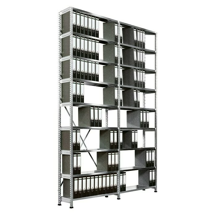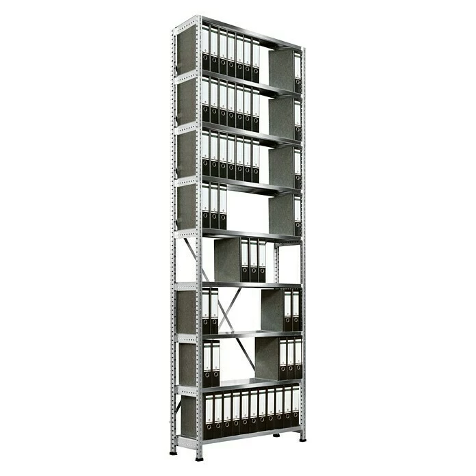 Das Metallregal von Scholz gibt Ihnen die Möglichkeit, auf geringer Grundfläche den größtmöglichen Stauraum in Anspruch zu nehmen. Das Regal bietet auf 9 Regalböden passgenauen Stauraum für Aktenordner oder andere einzulagernde Artikel. Jeder Regalboden erbringt eine Tragkraft von 80 kg. Das Regal besteht aus Metall und ist verzinkt. Somit erbringt es die höchstmögliche Belastbarkeit und Lebensdauer. Die Böden lassen sich über die Verstellraster im 30 mm Abstand variieren. Die Ecken des Regales sind abgerundet, sodass bei einem möglichen Zusammenstoß keine Verletzungen entstehen.