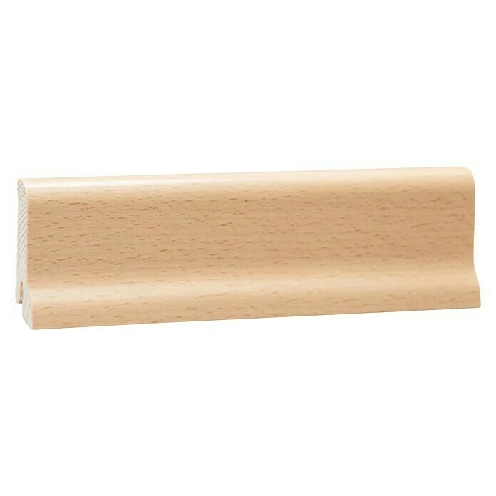 Diese hochwertige Sockelleiste ziert ein helles, freundliches Buche-Echtholzfurnier. Sie verfügt über einen massiven Fichtenholzkern und weist dadurch eine herausragende Stabilität auf. In Natur lackiert und mit geschwungenem Profil erzeugt sie einen harmonischen und ansprechenden Abschluss zwischen Wand und Boden. Die Clip-Nut auf ihrer Rückseite ermöglicht eine Montage ohne Schrauben oder Kleben.