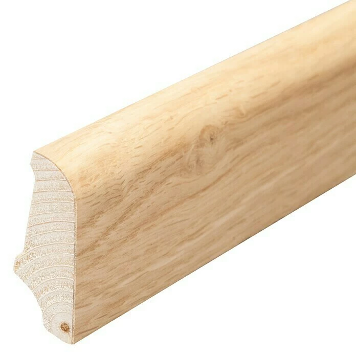 Diese Sockelleiste zählt mit einem Kern aus massivem Fichtenholz sowie einer Ummantelung aus Eiche zu den Premiumvarianten, denn Furnier ist nicht gleich Furnier. Die äußerst stabile Sockelleiste ist mit einem Naturlack versehen, der einen edlen, unaufdringlichen Glanz verleiht und sie zusätzlich schützt. Ihre Profilform ist konisch und damit klassisch schlicht gehalten, so dass das Modell zu einer Vielzahl an Einrichtungsstilen passt.