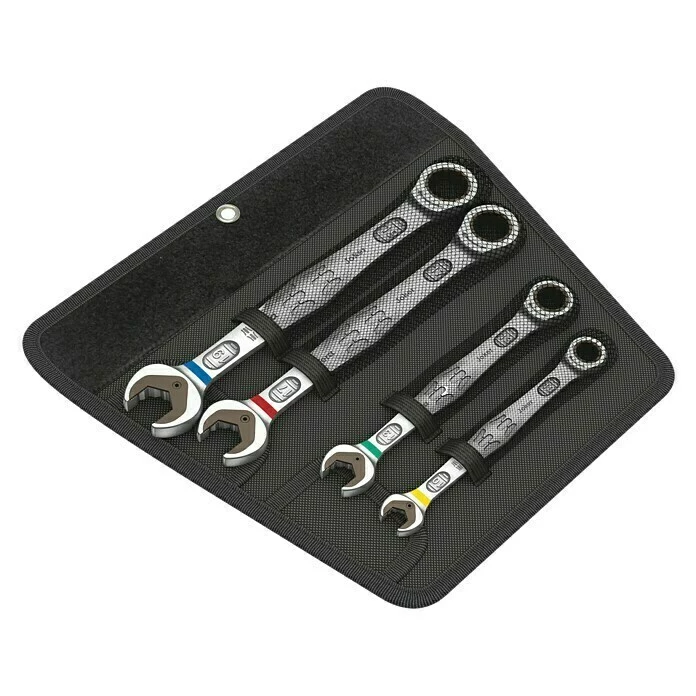 Der Maul- und Ringratschenschlüssel-Satz Joker von Wera löst Schraubaufgaben in hoher Geschwindigkeit und mit hoher Präzision. Jeder Schlüssel besitzt eine praktische Haltefunktion durch eine auswechselbare Metallplatte im Maul, die die Gefahr des Verlierens von Schrauben und Muttern reduziert. Seine Ratschenmechanik auf der Ringseite weist eine außergewöhnlich hohe Feinverzahnung mit 80 Zähnen auf und sorgt auch in engen Bauräumen für Flexibilität. Außerdem garantiert die spezielle Schmiedegeometrie in Kombination mit dem hochwertigen Material eine sehr lange Lebensdauer, hohe Verschleißfestigkeit und einen nachhaltig hohen Korrosionsschutz. Dank des kleinen Rückholwinkels ist kein Wenden des Schlüssels nötig. Zudem kann der integrierte Endanschlag das Abrutschen vom Schraubenkopf nach unten verhindern und ermöglicht somit das Aufbringen hoher Drehmomente.