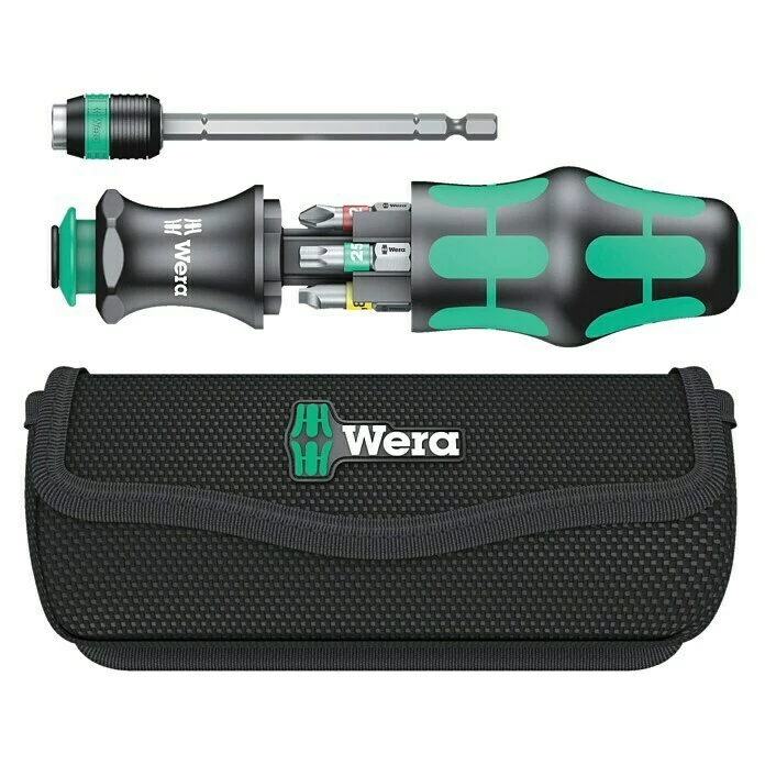 Das Schraubendreher-Set Kraftform Kompakt 20 Tool Finder 1 von Wera ist ein Kompaktwerkzeug, das sowohl für den Hand- als auch für den Maschinenbetrieb geeignet ist. Die Wechselklinge lässt sich genauso wie die vier mitgelieferten Bits im Handgriff verstauen. Eingezogen ist sie für Arbeiten auf engem Raum und in ausgefahrener Position als herkömmlicher Schraubendreher einsetzbar. Das Schnellwechselfutter ermöglicht eine schnelle Handbetätigung und Wechseln des Werkzeugs. Die Rapidaptor-Technologie sorgt für eine gute Führung beim Maschinenbetrieb dank Freilaufhülse. Die Klinge lässt sich in einem weiteren Handgriff vom Griff lösen und als Bithalter in andere Maschinen einsetzen. Der mehrkomponentige Handgriff ist mit seinem ergonomischen Design sehr handschonend und mit Wegrollschutz versehen. Im Griff befindet sich ein Bit-Depot sodass nötige Werkzeuge stets griffbereit sind. Die Größen sind zu Prägung zusätzlich mit dem Farbensystem „take it easy“ von Wera versehen. Das System ordnet jeder Größenordnung eine Farbe zu, die bei allen „take it easy“-Produkten übereinstimmt.
