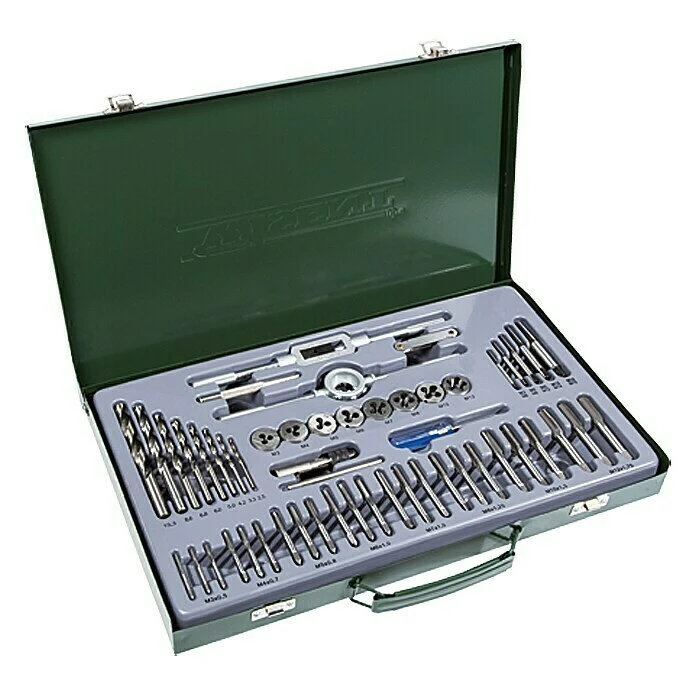 Der Gewindeschneid- und Bohrsatz von Wisent umfasst 51 Teile unter anderem Handgewindebohrersatz (3-tlg.), Schneideisen M3 – M12, Windeisen, Schneideisenhalter, Schraubenausdrehersatz und Bohrer. Mit diesem Gewinde-Set sind Sie für jegliche Anforderungen ideal ausgestattet.